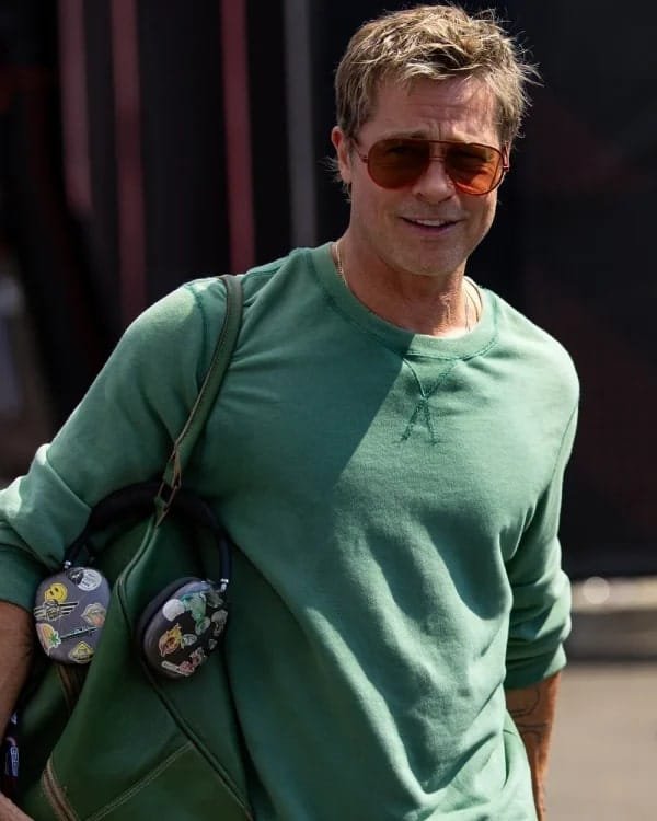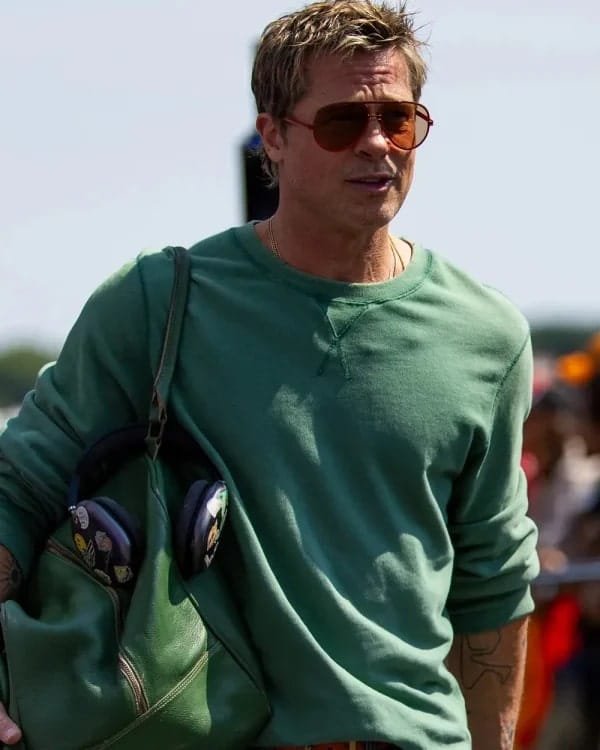 Capture the essence of brad Pitt’s off duty racer style with limited-edition green loopback sweatshirt – the same thyme green crewneck he sported as sonny Hayes in f1 the movie 2025 this loopback sweatshirt made from cotton polyester material, round collar neck collar, long sleeves, ribbed cuffs. The design features and every detail about this brad Pitt green sweatshirt is 10/10