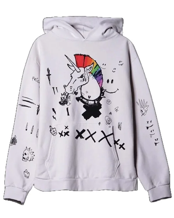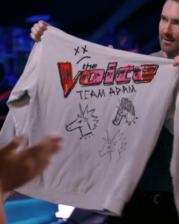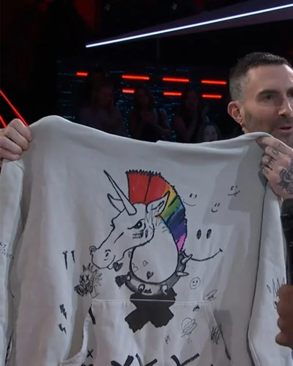 Demonstrate your loyalty to team Adam with this distinctive distressed-with hoodie, pretending by coach S27 The Voice Team Adam Hoodie artist as a welcoming gesture during blind audition and made from soft fleece fabric, pullover closure, rib knitted cuffs, white collar, and the voice logo team Adam and XX graphic and hand drawn unicorn graphic on front available in all sizes.