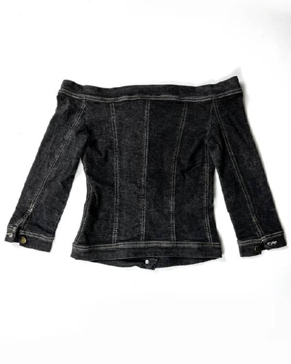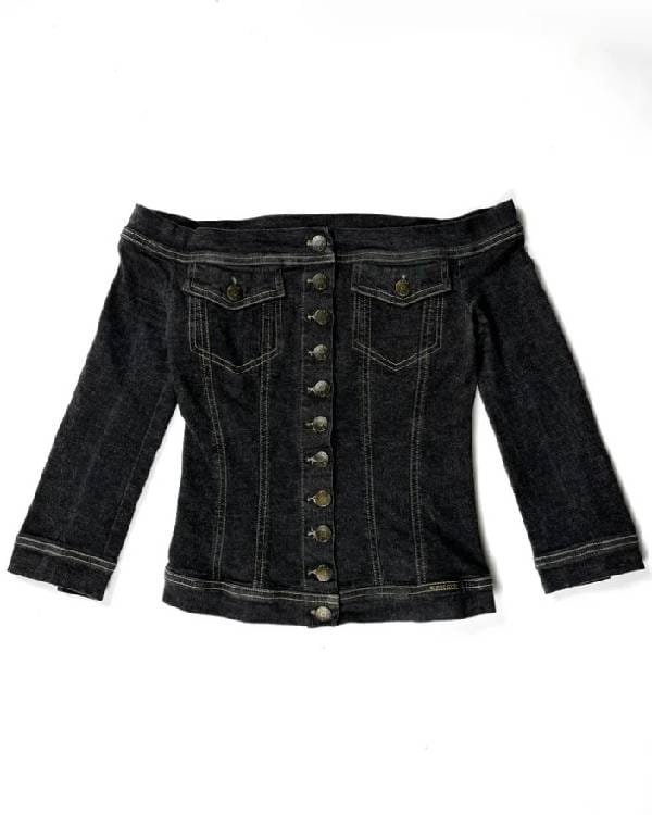 The Sarah Jessica Parker And Just Like That Denim Off The Shoulders Top Carrier Bradshaw’s fashion-forward scripted look redefines street style with the plein sud denim black off- shoulder top. Crafted from denim material, three quarter sleeves, two button-flap chest pockets, straight hem, button front closure and the top dips elegantly across the shoulders in a structured yet soft horizontal neckline, beautifully framing the collarbone while creating a very bold silhouette.
