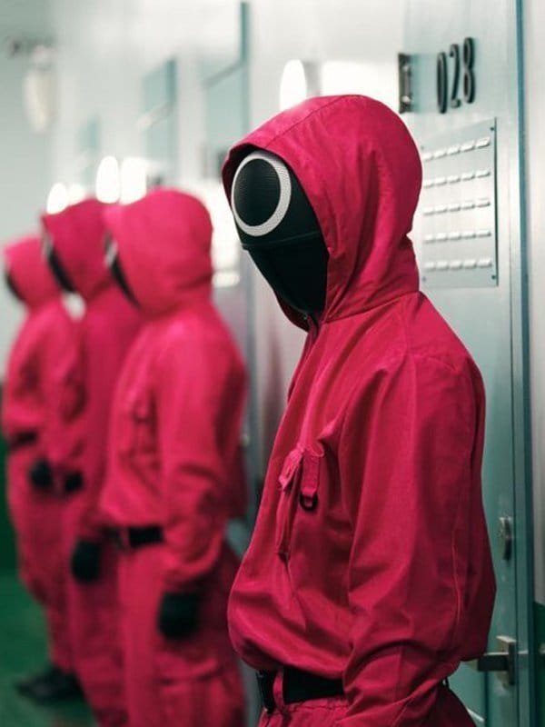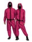 A notable feature is the attached hood, which obscures much of the wear’s identity mirroring the masked guards in the series. Complemented by the signature black mask adorned with either circle, triangle, or square symbol. If you are fan of squad games then definitely this fit is made for you. It’s suitable for prolonged wear whether you are participating in a Halloween celebration cosplay convention, themed photoshoot, this jumpsuit provides comfort, authenticity and drama this jumpsuit gives next level vibes.